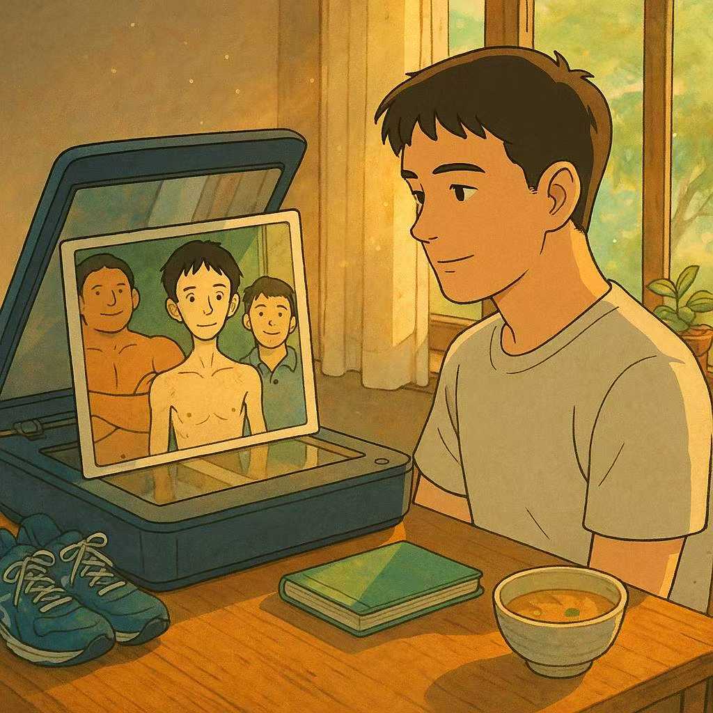 有一张照片尤其"经典",我们几个哥们儿在宿舍里光着膀子比肌肉。别人好歹还有点"肌"的轮廓,最不济也是白白胖胖,透着一股健康的油光。而我,夹在他们中间,像一只被拔了毛的猴儿,浑身上下除了排骨还是排骨,简直是"形销骨立"的活体代言人。看着照片里那个大头细颈的"生化危机"龙套演员,我默默地合上了相册,扫描的念头瞬间烟消云散。这哪是回忆青春,这简直是公开处刑,自毁形象。