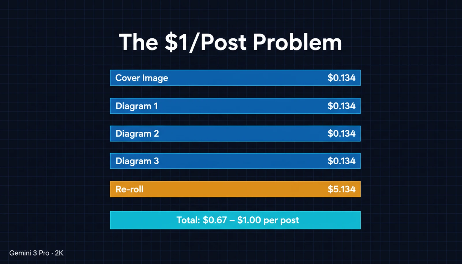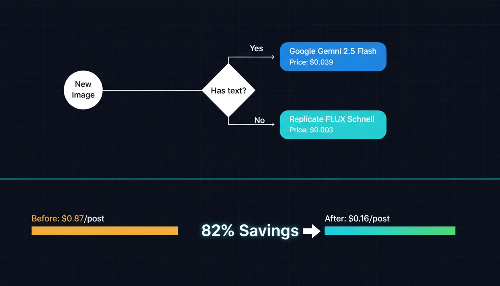Down from ~$0.87 to ~$0.16. That's an 82% reduction on a typical post. And if the cover had needed text? $0.039 instead of $0.003 — still massively cheaper than the old setup.