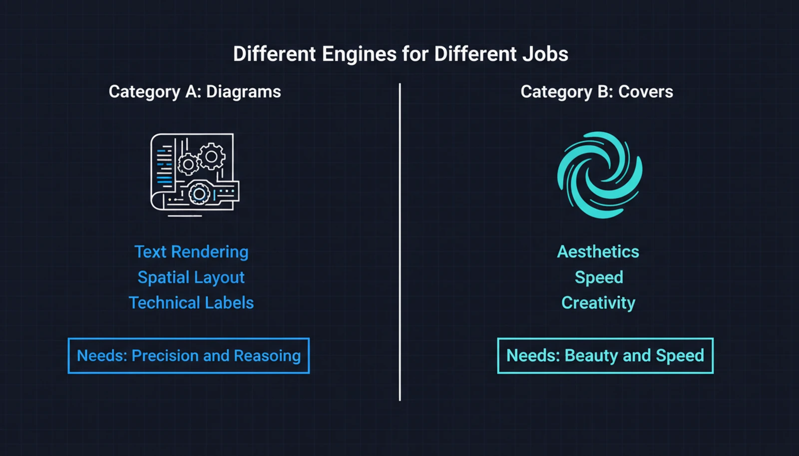 Category A — Diagrams with text and labels. Architecture overviews, framework comparisons, process flows with multiple text annotations. These need precise text rendering, clean layouts, and a model that "reasons" about spatial arrangement.