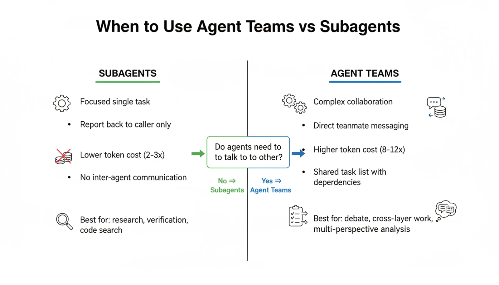 Think of it as the difference between delegating tasks to freelancers versus assembling a project team. The freelancer model is cheaper and simpler. The team model produces richer output — but it costs more and requires coordination overhead.