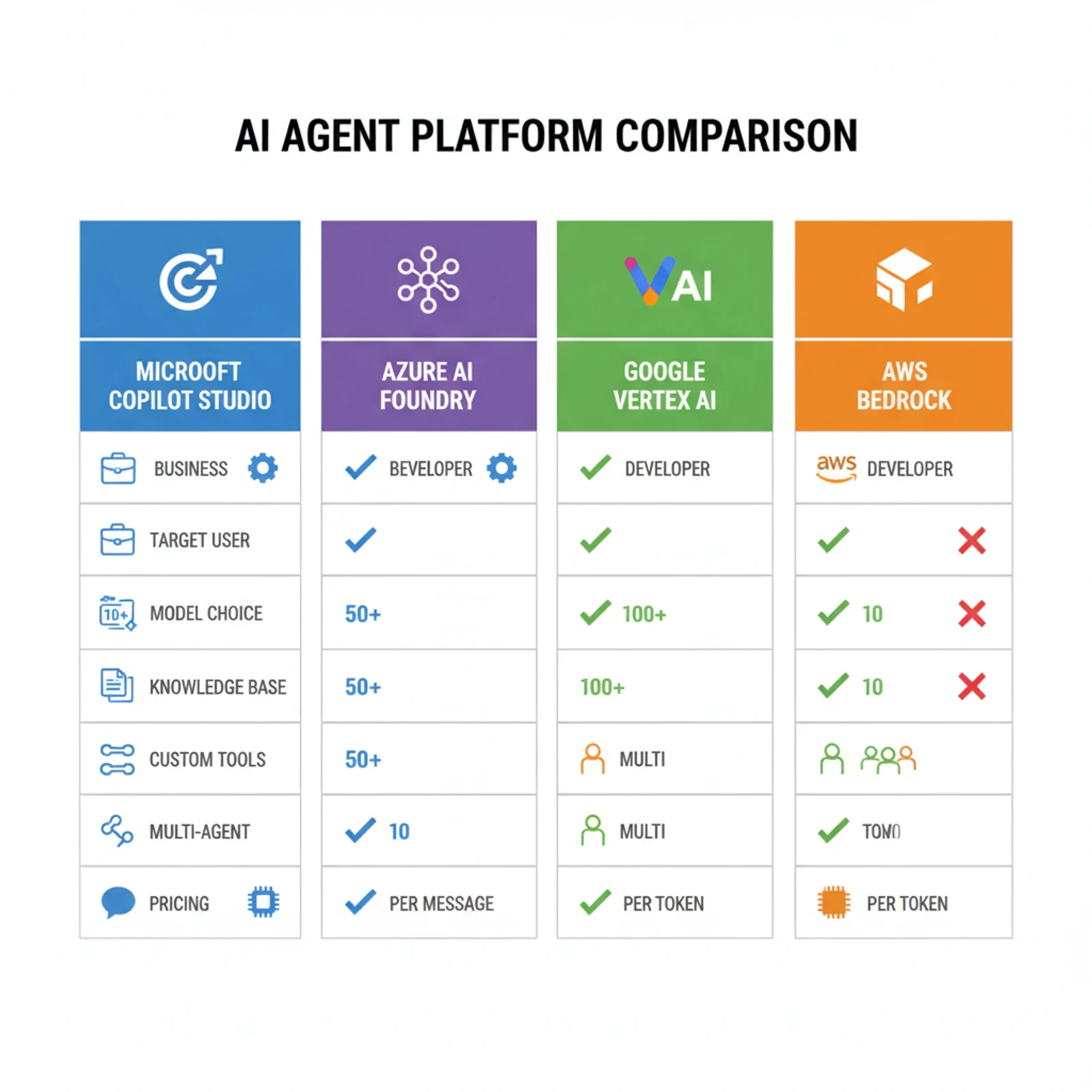 | Feature | Copilot Studio | AI Foundry | Vertex AI | Bedrock |