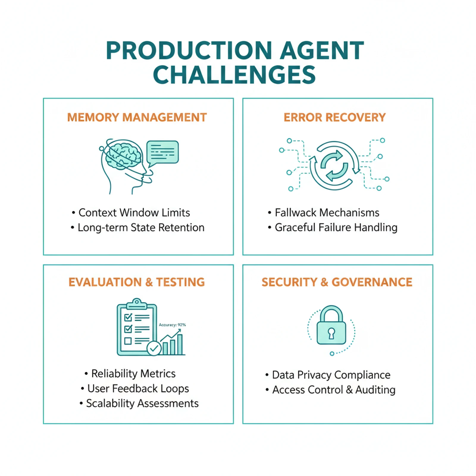 LLMs have finite context windows. A conversational agent that handles 50 messages hits the limit quickly when each tool call adds context. Production agents need: