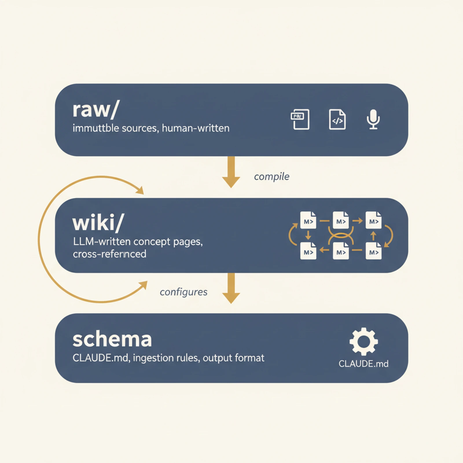 raw/— your original sources. Papers, transcripts, articles, repo dumps. Immutable. Humans put things in.wiki/— markdown pages written by the LLM. One concept per file, cross-linked like a real wiki. LLM writes, humans read.schema— aCLAUDE.mdplus a few workflows, telling the LLM how to ingest new raw material into wiki pages and how to format answers. Humans configure once.