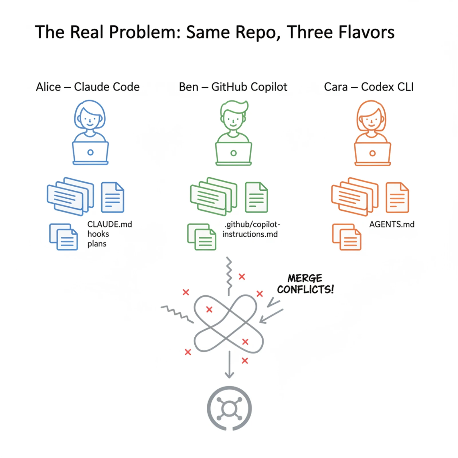 Three engineers, three tools, three separate instruction files — none of which anyone was keeping in sync.