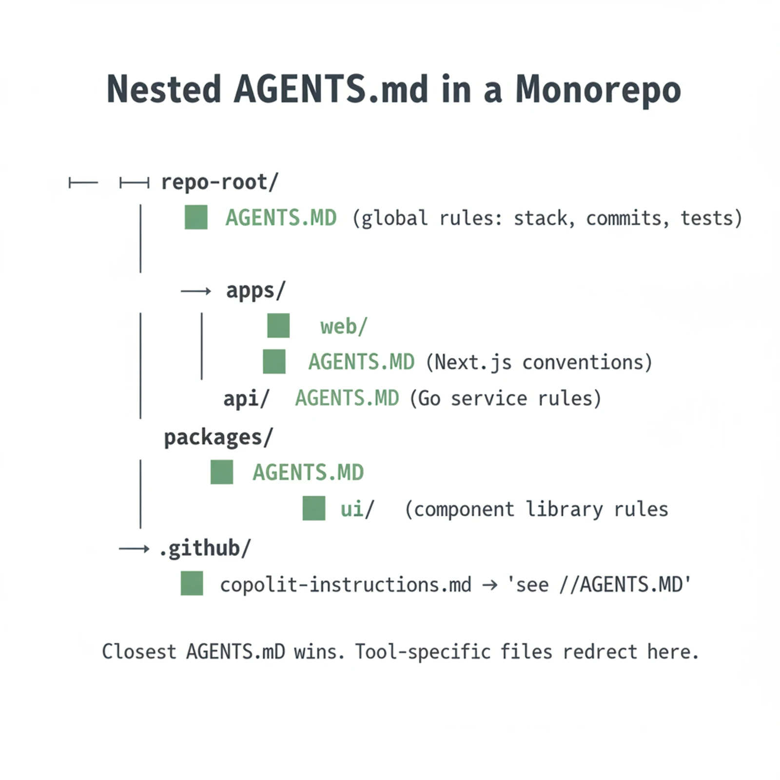 For monorepos, AGENTS.md is hierarchical. Drop one in each subdirectory, and the closest file to the work being done wins. apps/web/AGENTS.md can carry Next.js conventions while apps/api/AGENTS.md carries Go service rules, with a thinner global file at the root tying them together.