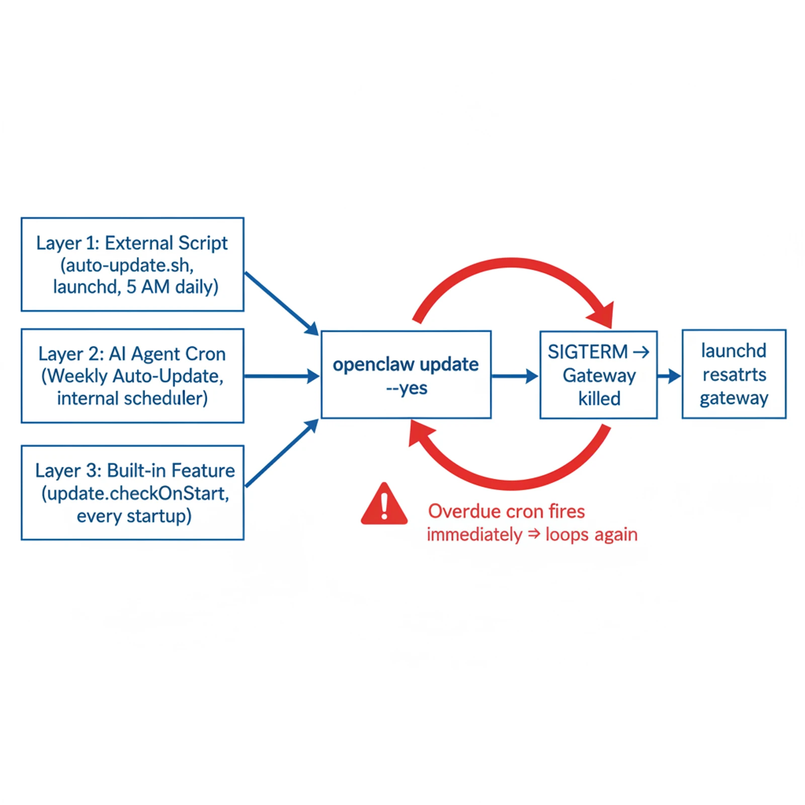 OpenClaw agents can schedule their own tasks via openclaw cron create. At some point — probably when I said something vague like "keep the system up to date" — the agent created two cron jobs: OpenClaw Weekly Auto-Update (core+skills) and a retry variant. Completely reasonable from its perspective. It couldn't see auto-update.sh sitting on the filesystem. It checked its own cron list, found nothing, made one.