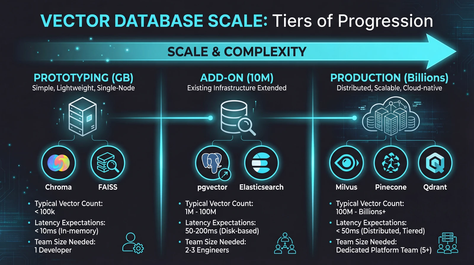 When to graduate: When you hit 10+ million vectors, need high availability, require complex filtering alongside vector search, or have multiple teams querying the same data, it's time to look at production-grade solutions.